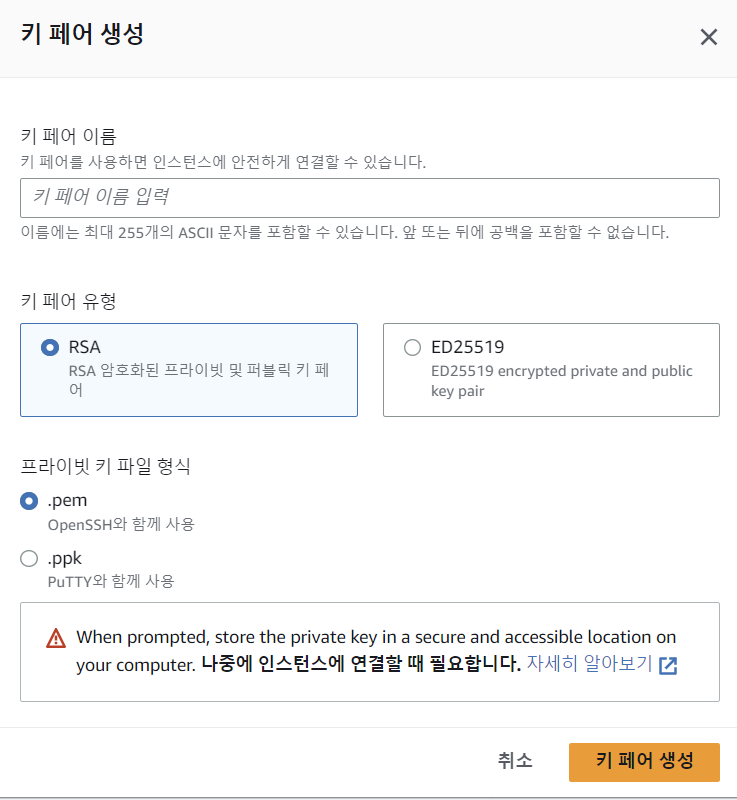키 페어 생성은 인스턴스에 연결할 때 필요한 암호같은 건데, 새 키 페어 생성을 누르면 아래와 같은 화면이 뜰거다.